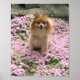 Photographie de la mignonne Poméranie nommée Marley assise dans le champ de fleurs roses.