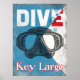 Key Largo Florida vintage scuba mask poster design. "Un bleu et blanc diver flag background with a retro scuba mask and word "dive" at the top.