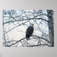 Une photo d'un aigle à tête blanche assis sur une branche d'arbre, regardant d'un côté, avec un morceau de poisson suspendu de son bec. L'oiseau semble avoir un sourcil, indiquant qu'il a le dégoût de celui qui l'a dérangé. L'arbre dans lequel l'aigle est perché n'a pas de feuilles comme la scène photographiée était en hiver. Copyright ©2021 Kimberly J Tilley.