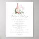 Un charmant menu de dégustation de vin botanique affiche vos sélections de vin surmontées d'une bouteille de vin rosé avec les initiales du couple inscrites, et deux verres à vin sur un lit de feuilles et de feuillage de eucalyptus aquarelle verte. Conçu pour correspondre à notre collection de faire-part Cheers to Love.