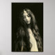 photo vintage d'une jeune femme aux cheveux très longs, un regard sérieux sur son visage quand elle regarde vers le bas et un petit bandeau métallique