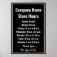 Il y a du texte blanc que vous pouvez modifier pour ajouter le nom de votre entreprise, un message personnalisé et vos heures d'ouverture quotidiennes du dimanche au samedi. Ce panneau des heures d'ouverture est noir. Le texte est blanc. La bordure sur l'affiche est blanche. Tout le texte peut être modifié ou supprimé. En bas, il y a plus de texte pour un message personnalisé (affiché : Merci pour votre visite)