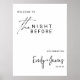 Un panneau de bienvenue conçu dans un arrière - plan blanc épuré avec un script noir moderne associé à une typographie en bloc audacieuse. Ce style minimaliste s'adresse à merveille aux mariages de la ville chic, aux dîners loft élégants ou aux rencontres prémariages intimes. Disponible en plusieurs tailles, il fait la pièce d'entrée parfaite pour la célébration "La Nuit avant".