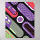 Un design abstrait pop art ludique avec des motifs en forme de bonbons en vert citron, violet et rouge sur un arrière - plan noir audacieux. Chaque forme de bonbons est décorée avec des arrosées, des rayures et des points, créant un style amusant et énergique inspiré de Memphis. La composition vibrante apporte une esthétique douce, moderne et jeune.