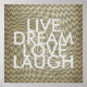 poster carré avec motif d'art graphique en détresse et texte citent en direct rêve amour rire. oeuvre d'art copyright Ann Powell.