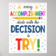 CHAQUE RÉALISATION COMMENCE PAR LA DÉCISION D'ESSAYER ! Un grand poster à accrocher dans une salle de classe, un bureau du conseiller scolaire, un bureau du travailleur social scolaire, un bureau du pédagogue ou de psychologue pour rappeler aux enfants que la première étape de toute réalisation est la volonté d'essayer! Un grand rappel pour renforcer la confiance et la participation dans la salle de classe. Une affiche très lumineuse, amusante et joyeuse pour décorer la salle de classe, le bureau de l'aide sociale, le bureau du thérapeute ou le bureau du conseiller.