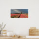 Affiche d'un paysage avec un moulin à vent et des fleurs de tulipe roses en rangs sur une ferme à bulbes sous un ciel gris dans la campagne de Pays-Bas au printemps. Superbe décoration sur votre mur !