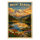 Travel poster featuring Mount Rainier, Washington, USA, in a classic retro travel-poster style. Central focus on the massive glacier-clad stratovolcano rising above evergreen forests and vibrant wildflower meadows, with crystal-clear alpine lakes reflecting the snow-covered summit. Soft golden sunset light filters through drifting Pacific Northwest clouds, creating a serene yet majestic wilderness atmosphere. Rich color palette of glacier white, deep forest green, alpine blue, and warm sunset amber. Clean graphic illustration with subtle vintage grain texture. Bold vintage typography headline: “MOUNT RAINIER – ICON OF THE PACIFIC NORTHWEST”. Vertical 2:3 layout, high-resolution, print-ready.