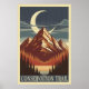 A stylized depiction of a mountain range under a crescent moon. Pine trees silhouette the foreground, and clouds drift across the sky.