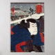 Imprimer par Utagawa Kuniyoshi montre un portrait de tête et épaules de l'espadon japonais et rōnin, Miyamoto Musashi; coupe à bois, couleur; 36,4 x 24,8 cm. ( 14,3 x 9,8 po)... Dans cette impression d'Utagawa Kuniyoshi (1798-1861), le célèbre espadon Miyamoto Musashi est vu en gros plan, sur fond de Mukôjima. De telles images montrent comment les maîtres d'Ukiyo-e ont mélangé l'illustration de la littérature, de la légende, ou de la littérature à la représentation du paysage. De ces mélanges, Ukiyo-e a développé ses propres traditions. Miyamoto Musashi (c. 1584 - 13 juin 1645), aussi connu sous le nom de Shinmen Takezō, Miyamoto Bennosuke ou, par son nom bouddhiste, Niten Dōraku, était un espadon et rōnin japonais. Musashi, comme on l'appelait souvent simplement, est devenu célèbre par les histoires de son excellent sens de l'épée dans de nombreux duels, même depuis un très jeune âge. Miyamoto Musashi (c. 1584 - 13 juin 1645), aussi connu sous le nom de Shinmen Takezō, Miyamoto Bennosuke ou, par son nom bouddhiste, Niten Dōraku, était un espadon et rōnin japonais. Musashi, comme on l'appelait souvent simplement, est devenu célèbre par les histoires de son excellent sens de l'épée dans de nombreux duels, même depuis un très jeune âge.