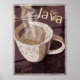 Chauffez votre mur avec cette affiche d'une oeuvre rustique vintage d'une tasse de café vapeur en terre, couleurs café avec le texte " Java ".