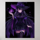 An enchanting anime-style illustration of a young witch with long black hair and captivating purple eyes. She wears a stylish black dress with purple accents, a wide-brimmed witch hat adorned with a purple ribbon, and thigh-high stockings. In her outstretched hand, she conjures shimmering purple magic, forming a delicate, star-like snowflake against a stark black background, highlighting her mystical aura.