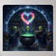 This fantasy poster features three frog wizards brew a glowing heart over a steaming cauldron in a moonlit potion lab filled with shelves of jars and mystical artifacts.