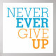 Bold positif message to share with the world, Never Ever Give Up ! Blue and orange Never Ever Give Up lettering. Stay strong and never ever give up !