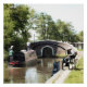 art design of a narrowboat approaching a lock and a man fishing. Canal boats, known in the UK as narrowboats, were originally used to transport goods around the country. They are now used mainly for leisure and attract people from all over the world to enjoy our rural countryside. These boats look very pretty with their brightly colored cabins, traditionally blue, red or green. Flowers and castle designs adorn the more traditional boats.