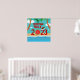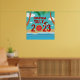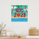 Noël en juillet 2023 illustration avec numéro d'année rouge gras 2023 décoré d'une chaîne lumineuse colorée, de pastèque coupée en tranches et d'un casquette du Père Noël rouge. Affiché sur la plage avec palmiers et eau de mer.