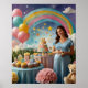 Entrez dans un jardin serein et capricieux avec ce mur d'art chaleureux, avec une femme enceinte entourée d'arcs-en-ciel, de soleil et de nuages moelleux. La scène saisit l'essence d'un baby shower joyeux avec une table décorée remplie de cupcakes, de cadeaux et de décorations sur le thème du bébé, le tout dans des tons pastel doux. Une citation élégante, "Our Rainbow Baby is Coming", ajoute un sentiment touchant, magnifiquement encadré en lettres fluides et douces. Les coups de pinceau doux et les couleurs chaudes pastel créent une atmosphère accueillante, ce qui en fait une pièce parfaite pour la décoration de pépinière ou un cadeau spécial pour les parents qui attendent leur petit miracle.