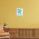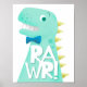 Joli design pour la décoration de votre chambre de bébé ou de vos enfants. Il y a une illustration d'un dinosaure vert avec des pointes jaunes, un nœud papillon bleu et un large sourire sur le visage. Sur son ventre, il est écrit "RAWR !" dans une typographie amusante. Idéal pour les garçons et les enfants.