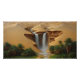 A captivating artwork depicting a cascading waterfall emerging between golden sand dunes, surrounded by lush palm trees and a vibrant green oasis. The painting reflects the contrast of nature between arid desert and flourishing greenery, creating a serene scene that transports the viewer to a world of tranquility and calm, where sand and water meet in stunning visual harmony.