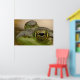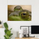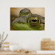 Cette affiche présente un gros plan de l'oeil d'une grenouille verte lorsqu'elle flotte dans l'étang par une chaude journée d'été. Son iris est un incroyable motif d'or et de jaune. La pure pupille ovale noire au centre reflète les arbres au loin.
