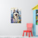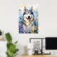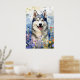 OEuvre colorée d'aquarelle d'un Husky assis dans un champ de fleurs printanières.
