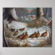 Un vieux tableau des années 1800 représentant une jolie illustration colorée d'oiseaux dans un décor hivernal.