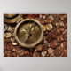 Une vieille boussole en laiton sur un arrière - plan de pièces.