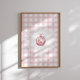 Affiche de vacances classique ornée d'un ornement rouge peint à la main avec ruban et verdure, dressée contre un arrière - plan en vichy chèque rose. Décor de mur festif parfait pour les fêtes de Noël, les fêtes saisonnières ou les vacances à la ferme.