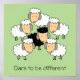 Impression amusante de moutons noirs. Un groupe de moutons blancs aux visages roses et aux oreilles grises entoure un mouton noir laineux, aussi au visage rose et aux oreilles grises. Ci-dessous, une légende "ose être différent" en lettres noires.