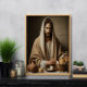 Dans cette représentation sereine, Jésus est représenté à une modeste table en bois, habillée d'une robe blanche avec un simple couvre-chef. Ses mains tiennent tendrement un morceau de pain, le brisant dans un moment riche de signification spirituelle. Cet acte rappelle la Dernière Cène, événement fondateur de la théologie chrétienne, qui représente le sacrifice ultime et l'unité par la foi. Deux vaisseaux d'argile reposent à côté de Lui, l'un symbolisant le vin de l'alliance et l'autre soulignant la simplicité du cadre. Un panier tissé plein de pains suggère une abondance et une disposition divines, reliant la scène aux thèmes de la nourriture et de la grâce. L’expression de Jésus est douce et solennelle, invitant à la réflexion sur le caractère sacré du moment. Les éléments simples mais significatifs sur la table soulignent Son humilité et le message profond derrière Ses actions. Cette image attire les spectateurs dans un état méditatif, leur rappelant l'amour, le sacrifice et les enseignements de Jésus. Il sert de représentation puissante de l'Eucharistie, encourageant une foi plus profonde et un lien avec Son message éternel de paix, de service et de dévotion.