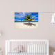 Cette photo montre un palmier debout sur une plage de sable blanc.