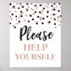 Panneau aide-toi pour baby shower, bridal shower, anniversaire ou mariage avec un motif de confettis rose gold et noir.