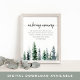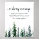 Conçu pour correspondre à notre collection de mariage Timber Grove, ce panneau chic de la forêt hivernale est parfait pour être placé sur une table commémorative ou un présentoir en l'honneur des êtres chers disparus. Personnalisez l'en-tête et le texte du corps (représentés par "In Loving Memory" et un court poème), accentués d'une bordure inférieure de pins aquarellés dans des tons de vert chasseur et forêt.