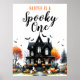 Panneau d'anniversaire Spooky One 1ère année. Accueillez vos invités avec style grâce à ce panneau de fête amusant et festif, parfait pour le premier anniversaire d'un garçon ou d'une fille. En haut, la phrase « Nom est un Spooky One » est affichée dans un mélange de polices de caractères ludiques et simples. Le centre présente une maison hantée noir et blanc rehaussée de citrouilles orange, de jack-o'-lanterns et d'arbres effrayants, avec des fantômes et des chauves-souris fantaisistes pour un charme supplémentaire. Idéal pour accueillir les invités et créer une ambiance d'anniversaire d'Halloween festive.