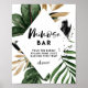 Panneau de bar mimosa à verdure rustique à ajouter à vos douches et fêtes d'été. Il présente des illustrations à l'aquarelle de feuilles tropicales avec des accents de feuille d'or faux et des traits de pinceau noir. Ce panneau de mimosa à verdure est parfait pour les douches de mariée estivales et les douches de bébé.