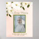 Cette belle pancarte funéraire florale élégante représentant une femme avec des fleurs blanches, une photo de votre proche dans un cadre vert, leur nom et les dates de vie. Le fond de ce mémorial en mémoire vivante est rose pêche pâle.