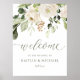 Panneau de bienvenue de mariage élégant - Bouquet de feuillage de verdure floral blanc : accueillez vos invités de mariage avec ce panneau de bienvenue de 18 x 24 pouces ! Ce panneau présente un magnifique bouquet à l'aquarelle avec des fleurs blanches, de la verdure et une touche de paillettes dorées fausses. Le beau « bienvenue » est réalisé dans un script de calligraphie moderne qui complète parfaitement le design !