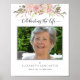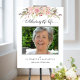 Mes condoléances pour votre perte. Honorez votre proche avec un élégant panneau de bienvenue de photo de funérailles délicat et attentionné avec un exquis design floral aquarellé peint à la main en haut et la phrase "Célébrer la vie de" en calligraphie moderne et gracieuse. Choix de plusieurs tailles. Détails floraux dans des tons rose blush, crème, rose, or rose, mauve et violet. Faire-part de funérailles/célébration de vie, livre d'or, cartes de remerciement et programme coordonnés disponibles. Fait partie de notre collection "Funérailles délicates, Mémorial".