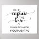 Ce panneau de calligraphie noire simple "capturez l'amour" est parfait pour un mariage rustique. Le design minimaliste présente une police de caractères à l'encre élégante et un cœur féminin charmant. Le panneau indique "aidez à capturer l'amour en utilisant le hashtag : votre hashtag".