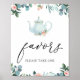 Panneau de faveur avec une illustration d'une théière avec une bordure de fleurs roses et de verdure avec le mot "favors" dans un script de calligraphie amusant.