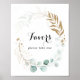Ce panneau de faveurs florales en eucalyptus rustique or est parfait pour un mariage simple ou une baby shower. Ce design artistique présente des fleurs dorées dessinées à la main et un feuillage vert d'eucalyptus aquarellé, joliment disposés dans un cadre géométrique élégant.
