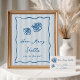 Ce magnifique panneau de jeu de devinettes côtier présente des lettres manuscrites de style bleu méditerranéen accentuées d'une bordure de ruban ondulé griffé, avec deux illustrations de coquillages dessinés à la main et les mots "combien de coquillages sont dans le pot?" Prêt à cadrer ; choisissez l'impression et l'expédition professionnelles ou l'option de téléchargement instantané pour imprimer localement ou à la maison. Associez-vous à nos cartes de jeu de devinette assorties de notre collection Love & Lobster.