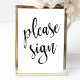 Un panneau de mariage élégant et moderne, avec le texte "Merci de signer" dans une police de caractère script extrovertie, la texture de brosse ajoute une sensation spontanée et ludique. La couleur de fond peut être personnalisée en fonction de vos besoins et préférences, veuillez me contacter si vous avez une demande spéciale.