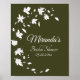 Un design de panneau de mariage moderne et élégant avec une gerbe de fleurs blanches et un texte personnalisable blanc sur fond vert automnal. Montez ou encadrez pour une belle exposition sur table.