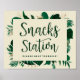 Panneau de signalisation de la station de snacks de réception de mariage personnalisé avec feuillage tropical, verdure tendance et feuilles - Lettre script brossé tendance. Une façon amusante de dire merci à vos invités d'être venus à votre mariage ! Dans une palette de couleurs audacieuses de verts riches, émeraude et doré. Ce design est parfait pour un mariage à la plage, de destination ou d'été. Avec des sentiments de paradis tropical, ce design de feuilles de palmier vives complétera votre lieu de mariage à la plage ou tropical. Dans un schéma de couleurs vert foncé, sarcelle, émeraude, verdure et or - Panneau de signalisation de la station de snacks de réception de mariage personnalisé !