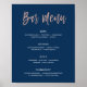 LEAH • Ce panneau de menu de bar bleu marine et or rose est parfait pour les mariages romantiques et élégants. La passion est apportée par la police de caractères manuscrite mignonne dans la texture de feuille d'or rose «faux» tandis que le fond bleu marine stylé combiné au texte blanc ajoute une touche de précieux. Cette collection se coordonne bien avec les célébrations glamour, en particulier pour les événements intérieurs, d'automne ou d'hiver.