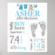 Accrochez ce souvenir personnalisé de la nurserie sur le mur de votre bébé. Ce panneau de naissance de bébé garçon bleu contient toutes les informations relatives à sa naissance, y compris la date, l'heure de naissance, le poids et le lieu de naissance. Il y a même un espace où vous pouvez ajouter son empreinte de pied. Ajoutez son score d'Apgar enregistré à l'hôpital qu'il a reçu peu après la naissance.