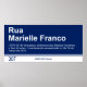 Marque de rue - Marielle Franco Marielle Franco (prononciation portugaise : [matrimiˈenti li ˈfpublic ku], née Marielle Francisco da Silva ; 27 juillet 1979 - 14 mars 2018) était une femme politique brésilienne, féministe et militante des droits de l'homme. Après avoir obtenu une maîtrise en administration publique de l'Université Fédérale Fluminense, elle a été conseillère municipale de la Chambre Municipale de Rio de Janeiro pour le Parti Socialisme et Liberté (PSOL) de janvier 2017 jusqu'à sa mort. Le 14 mars 2018, alors qu'elle était dans une voiture après avoir prononcé un discours, Franco et son chauffeur ont été abattus à plusieurs reprises par deux meurtriers dans un autre véhicule, au nord de Rio de Janeiro. Franco s'est exprimé ouvertement contre les brutalités policières et les exécutions extrajudiciaires, ainsi que l'intervention fédérale du président brésilien Michel Temer en février 2018 dans l'état de Rio de Janeiro, qui a abouti au déploiement de l'armée dans les opérations policières.