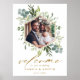 Cette affiche de bienvenue mariage présente des eucalyptus à l'aquarelle peinte, des feuilles verts et une photo avec un cadre hexagone en faux or. Pour une personnalisation plus avancée de cette conception, cliquez sur le lien "Customiser plus loin". Des articles correspondants sont également disponibles.