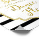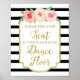 S'il vous plaît trouver votre siège, mais votre place est sur l'affiche de la piste de danse pour mariage en noir et blanc rayures motif, cadre vintage or glamour, fleurs rose et pêche vintage et texte de style lettré à la main.